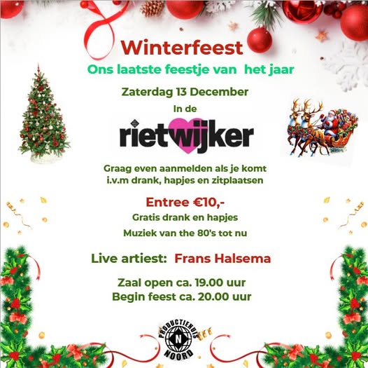 Winterfeest Zaterdag 13 december 2025 28.11.2025 Zaterdag 13 december 2025Zaal open 19:00 Begin feest 20:00 uurDe Rietwijker Print Mail Reageer