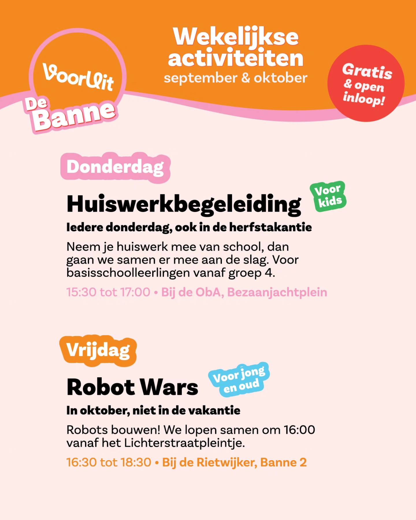 De VoorUiters uit ons team organiseren elke week leuke activiteiten in de Banne. Er is van alles te beleven in de Banne. Benieuwd wat er te doen is?